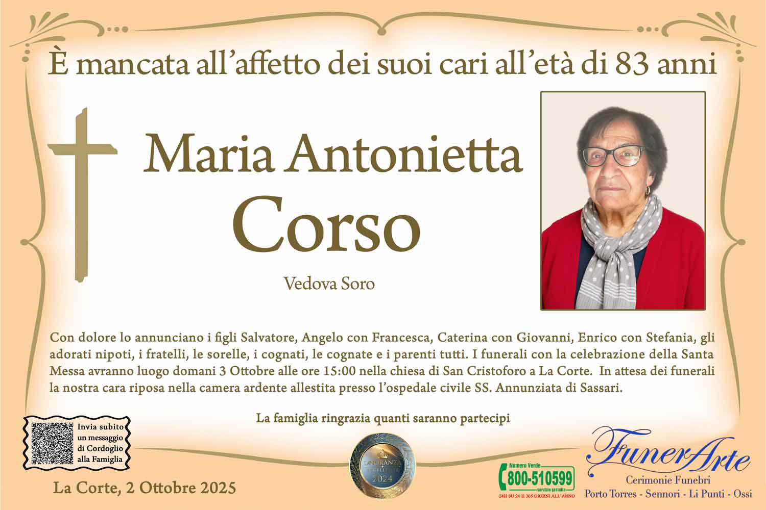 Con dolore lo annunciano i figli Salvatore, Angelo con Francesca, Caterina con Giovanni, Enrico con Stefania, gli adorati nipoti, i fratelli, le sorelle, i cognati, le cognate e i parenti tutti. I funerali con la celebrazione della Santa Messa avranno luogo domani 3 Ottobre alle ore 15:00 nella chiesa di San Cristoforo a La Corte. In attesa dei funerali la nostra cara riposa nella camera ardente allestita presso l’ospedale civile SS. Annunziata di Sassari.