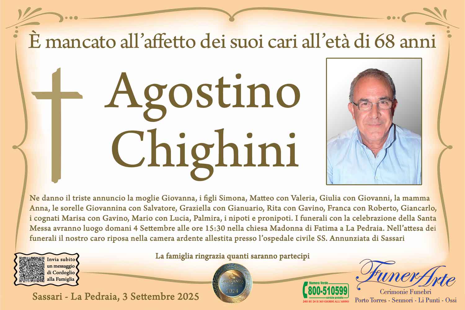 Ne danno il triste annuncio la moglie Giovanna, i figli Simona, Matteo con Valeria, Giulia con Giovanni, la mamma Anna, le sorelle Giovannina con Salvatore, Graziella con Gianuario, Rita con Gavino, Franca con Roberto, Giancarlo, i cognati Marisa con Gavino, Mario con Lucia, Palmira, i nipoti e pronipoti. I funerali con la celebrazione della Santa Messa avranno luogo domani 4 Settembre alle ore 15:30 nella chiesa Madonna di Fatima a La Pedraia. Nell’attesa dei funerali il nostro caro riposa nella camera ardente allestita presso l’ospedale civile SS. Annunziata di Sassari