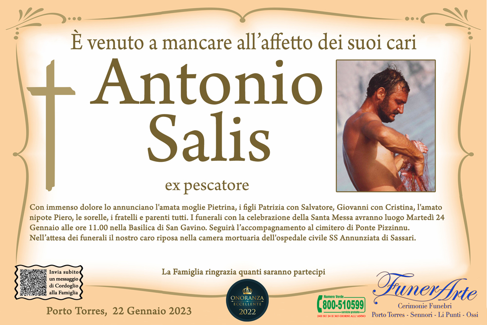 Con immenso dolore lo annunciano l'amata moglie Pietrina, i figli Patrizia con Salvatore, Giovanni con Cristina, l'amato nipote Piero, le sorelle, i fratelli e parenti tutti. I funerali con la celebrazione della Santa Messa avranno luogo Martedì 24 Gennaio alle ore 11.00 nella Basilica di San Gavino. Seguirà l’accompagnamento al cimitero di Ponte Pizzinnu. Nell’attesa dei funerali il nostro caro riposa nella camera mortuaria dell'ospedale civile SS Annunziata di Sassari.