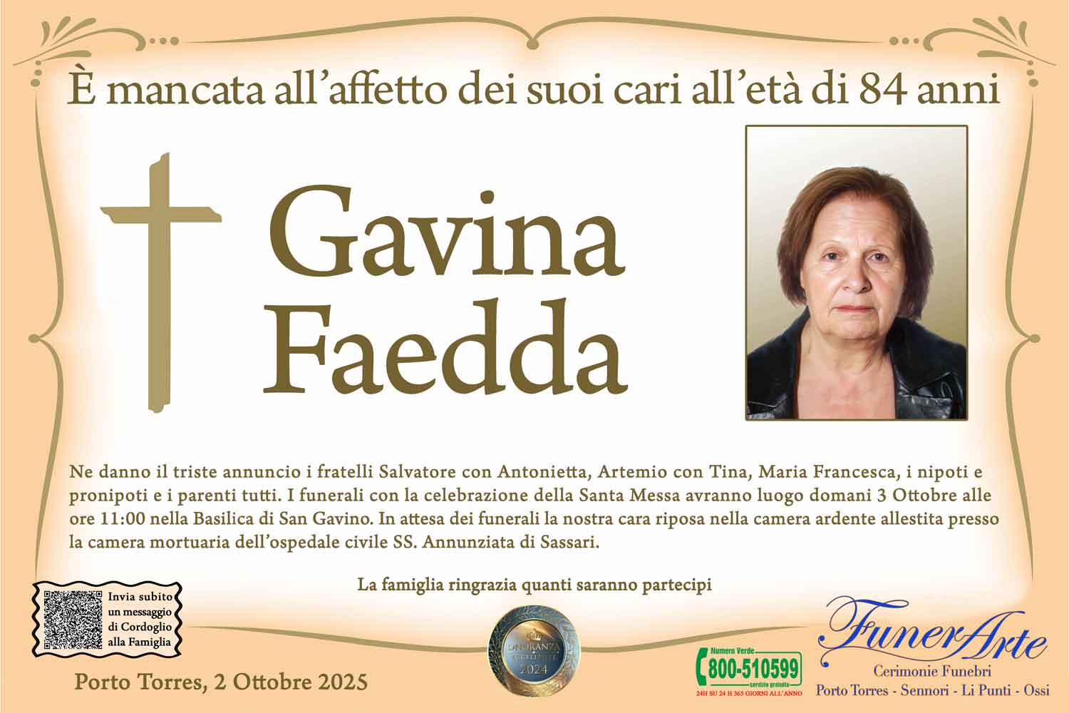 Ne danno il triste annuncio i fratelli Salvatore con Antonietta, Artemio con Tina, Maria Francesca, i nipoti e pronipoti e i parenti tutti. I funerali con la celebrazione della Santa Messa avranno luogo domani 3 Ottobre alle ore 11:00 nella Basilica di San Gavino. In attesa dei funerali la nostra cara riposa nella camera ardente allestita presso la camera mortuaria dell’ospedale civile SS. Annunziata di Sassari.
