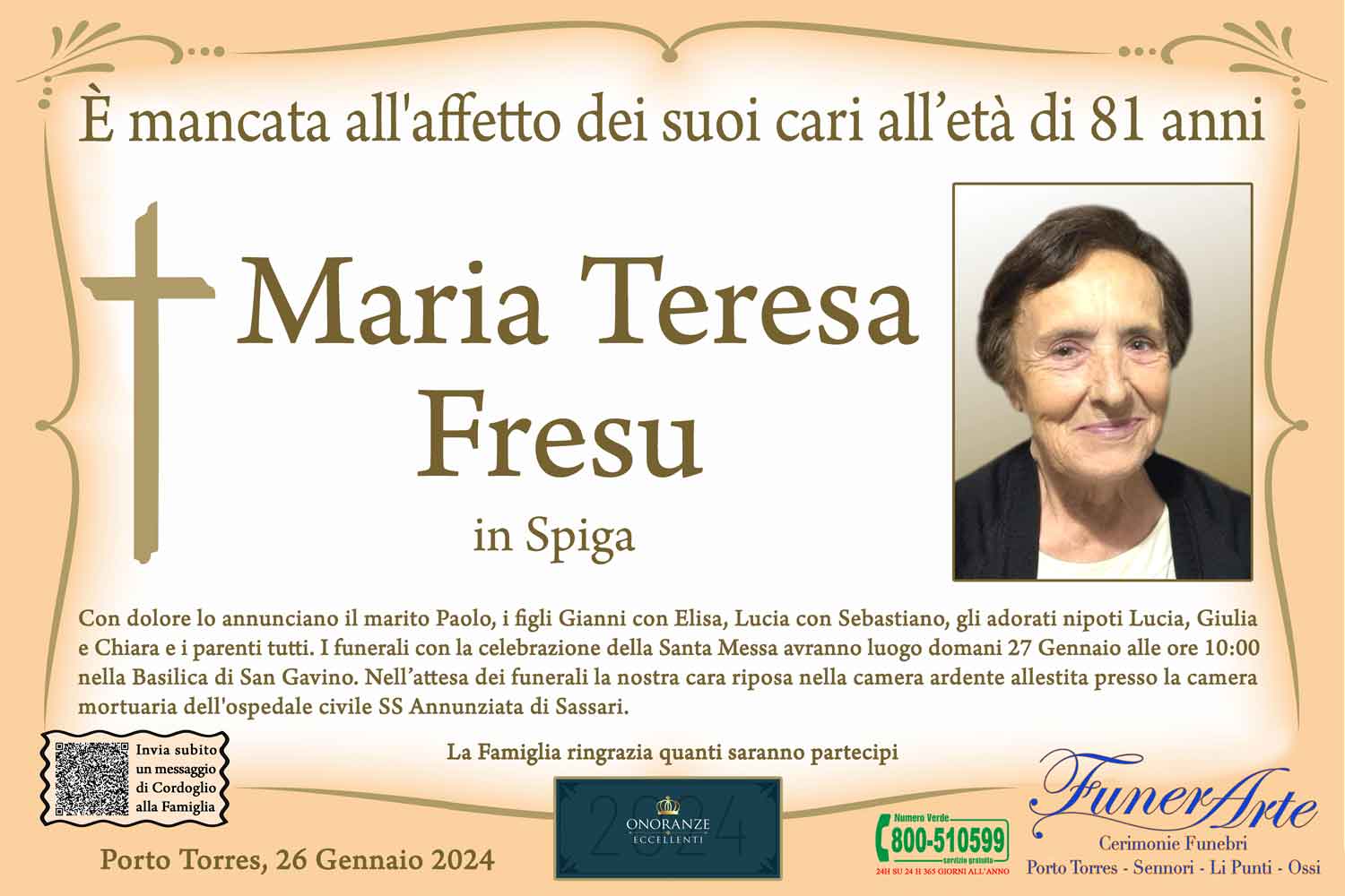 CON DOLORE LO ANNUNCIANO IL MARITO PAOLO, I FIGLI GIANNI CON ELISA, LUCIA CON SEBASTIANO, GLI ADORATI NIPOTI LUCIA, GIULIA E CHIARA E I PARENTI TUTTI. I FUNERALI CON LA CELEBRAZIONE DELLA SANTA MESSA AVRANNO LUOGO DOMANI 27 GENNAIO ALLE ORE 10:00 NELLA BASILICA DI SAN GAVINO. NELL' ATTESA DEI FUNERALI LA NOSTRA CARA RIPOSA NELLA CAMERA ARDENTE ALLESTITA PRESSO LA CAMERA MORTUARIA DELL' OSPEDALE CIVILE SS ANNUNZIATA DI SASSARI