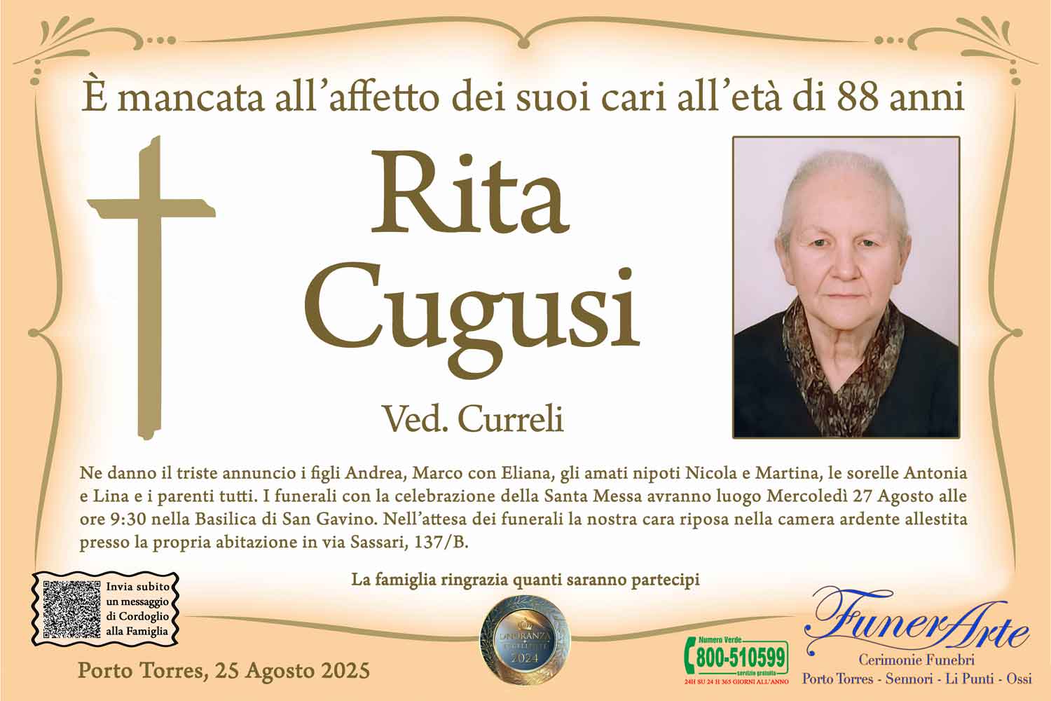 Ne danno il triste annuncio i figli Andrea, Marco con Eliana, gli amati nipoti Nicola e Martina, le sorelle Antonia e Lina e i parenti tutti. I funerali con la celebrazione della Santa Messa avranno luogo Mercoledì 27 Agosto alle ore 9:30 nella Basilica di San Gavino. Nell’attesa dei funerali la nostra cara riposa nella camera ardente allestita presso la propria abitazione in via Sassari, 137/B.
