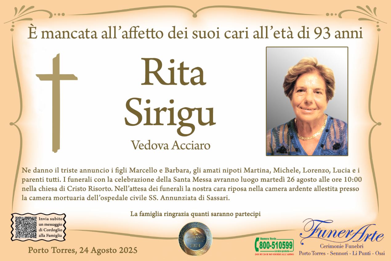 Ne danno il triste annuncio i figli Marcello e Barbara, gli amati nipoti Martina, Michele, Lorenzo, Lucia e i parenti tutti. I funerali con la celebrazione della Santa Messa avranno luogo martedì 26 agosto alle ore 10:00 nella chiesa di Cristo Risorto. Nell’attesa dei funerali la nostra cara riposa nella camera ardente allestita presso la camera mortuaria dell’ospedale civile SS. Annunziata di Sassari.