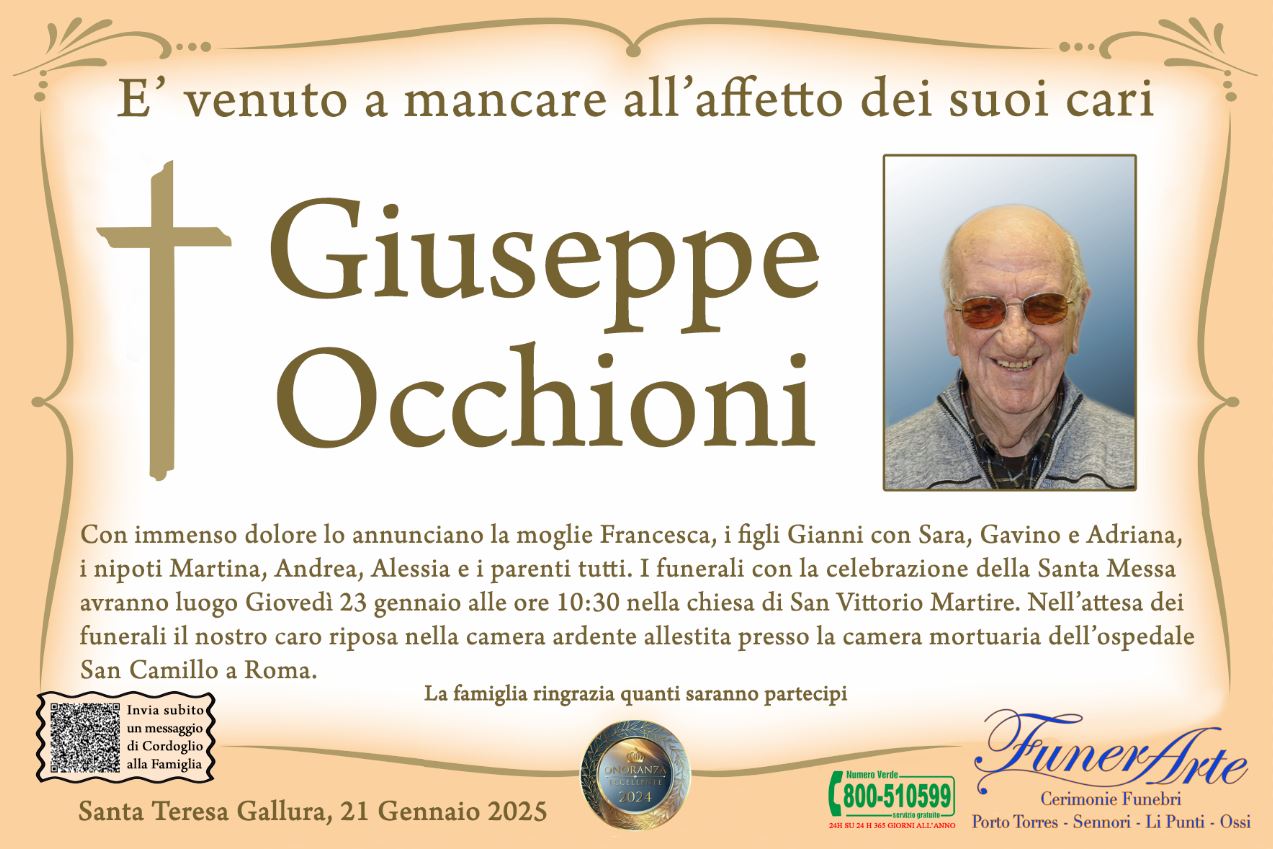 Con immenso dolore lo annunciano la moglie Francesca, i figli Gianni con Sara, Gavino e Adriana, i nipoti Martina, Andrea, Alessia e i parenti tutti. I funerali con la celebrazione della Santa Messa avranno luogo Giovedì 23 gennaio alle ore 10:30 nella chiesa di San Vittorio Martire. Nell’attesa dei funerali il nostro caro riposa nella camera ardente allestita presso la camera mortuaria dell’ospedale San Camillo a Roma.