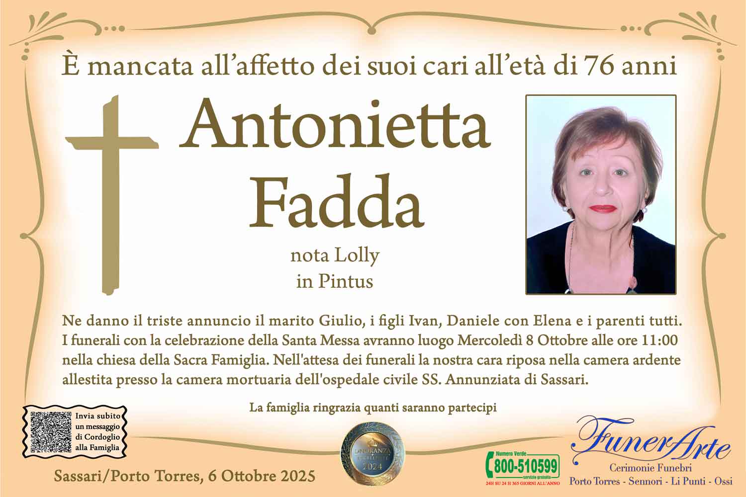 Ne danno il triste annuncio il marito Giulio, i figli Ivan, Daniele con Elena e i parenti tutti. I funerali con la celebrazione della Santa Messa avranno luogo Mercoledì 8 Ottobre alle ore 11:00 nella chiesa della Sacra Famiglia. Nell'attesa dei funerali la nostra cara riposa nella camera ardente allestita presso la camera mortuaria dell'ospedale civile SS. Annunziata di Sassari.