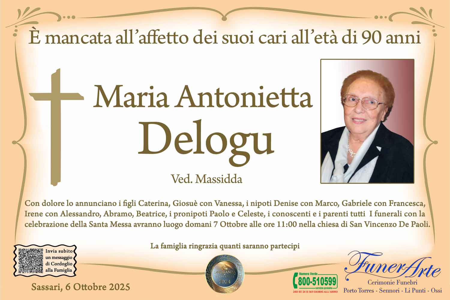 Con dolore lo annunciano i figli Caterina, Giosuè con Vanessa, i nipoti Denise con Marco, Gabriele con Francesca, Irene con Alessandro, Abramo, Beatrice, i pronipoti Paolo e Celeste, i conoscenti e i parenti tutti I funerali con la celebrazione della Santa Messa avranno luogo domani 7 Ottobre alle ore 11:00 nella chiesa di San Vincenzo De Paoli.