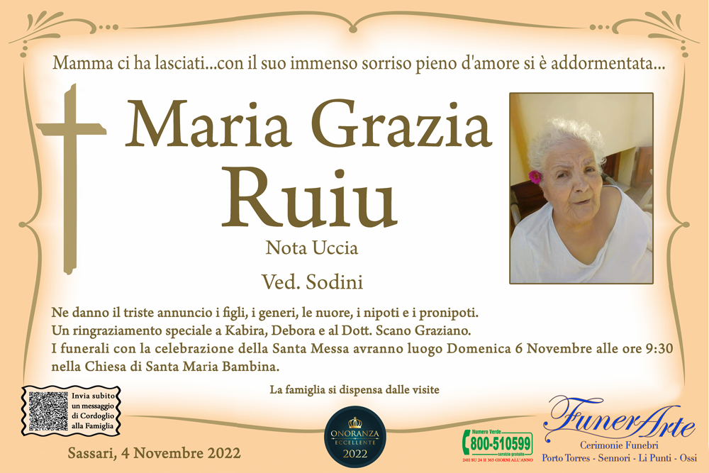 Ne danno il triste annuncio i figli, i generi, le nuore, i nipoti e i pronipoti. Un ringraziamento speciale a Kabira, Debora e al Dott. Scano Graziano. I funerali con la celebrazione della Santa Messa avranno luogo Domenica 6 Novembre alle ore 9:30 nella Chiesa di Santa Maria Bambina.
