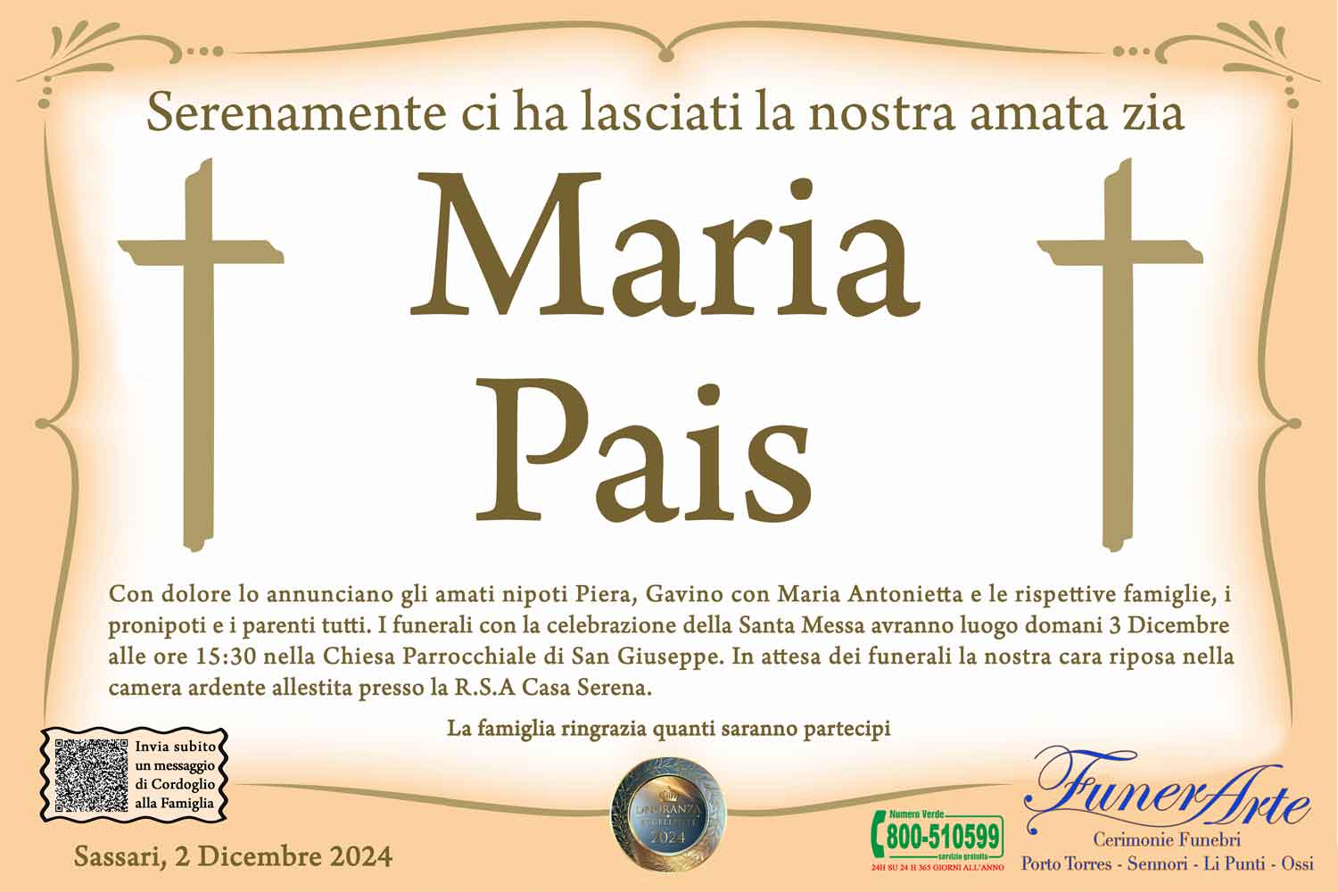 Con dolore lo annunciano gli amati nipoti Piera, Gavino con Maria Antonietta e le rispettive famiglie, i pronipoti e i parenti tutti. I funerali con la celebrazione della Santa Messa avranno luogo domani 3 Dicembre alle ore 15:30 nella Chiesa Parrocchiale di San Giuseppe. In attesa dei funerali la nostra cara riposa nella camera ardente allestita presso la R.S.A Casa Serena.