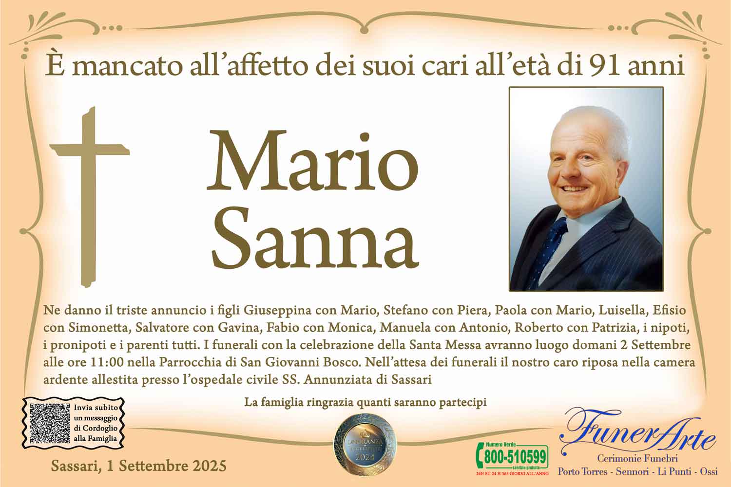 Ne danno il triste annuncio i figli Giuseppina con Mario, Stefano con Piera, Paola con Mario, Luisella, Efisio con Simonetta, Salvatore con Gavina, Fabio con Monica, Manuela con Antonio, Roberto con Patrizia, i nipoti, i pronipoti e i parenti tutti. I funerali con la celebrazione della Santa Messa avranno luogo domani 2 Settembre alle ore 11:00 nella Parrocchia di San Giovanni Bosco. Nell’attesa dei funerali il nostro caro riposa nella camera ardente allestita presso l’ospedale civile SS. Annunziata di Sassari